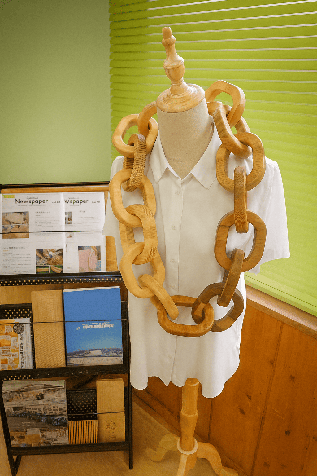 岐阜県産材の桧と杉をはじめ、様々な樹種の集成材で製作した