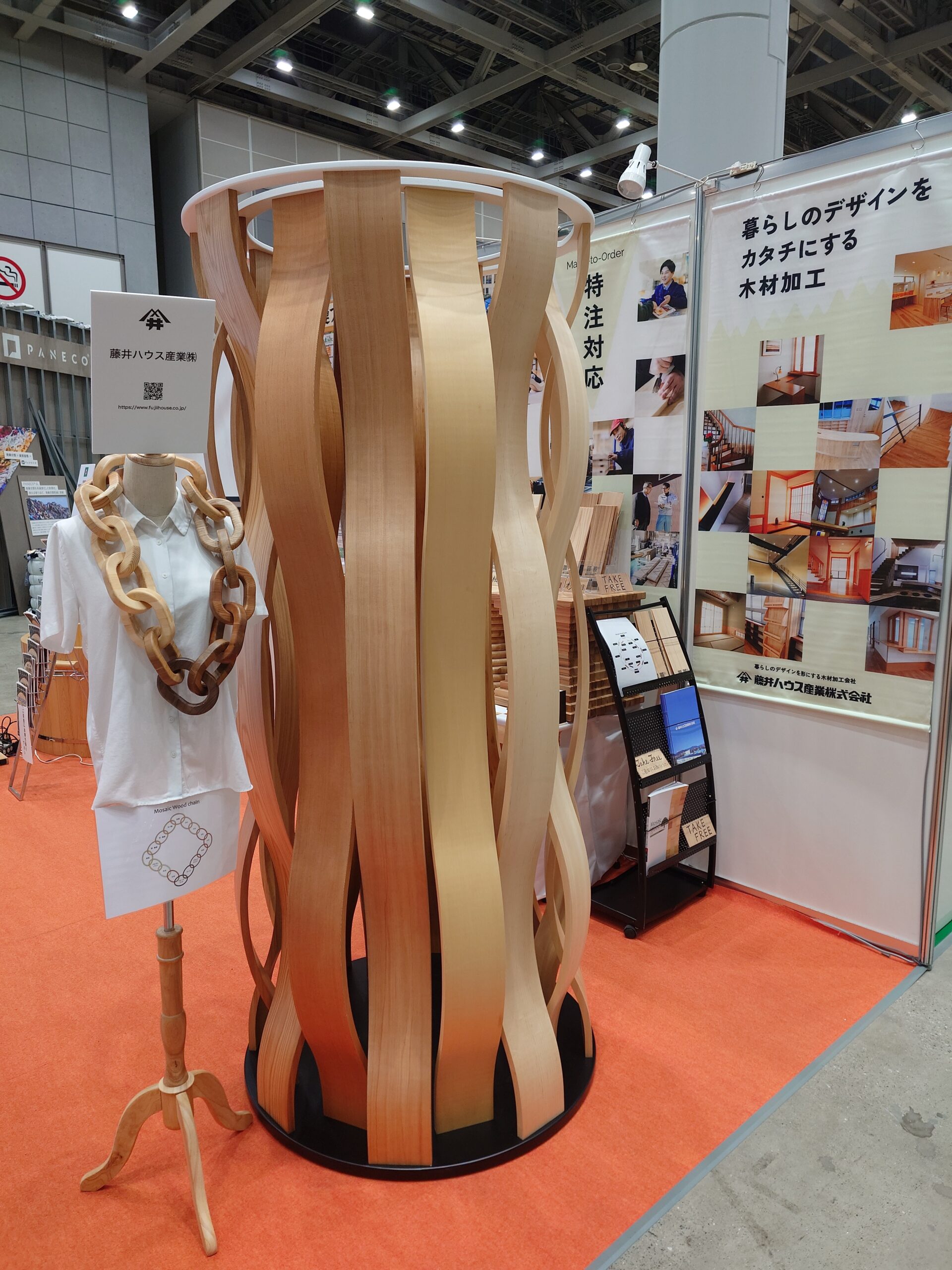 今回は16種の積層材(造作用集成材)でのチェーンを展示しましたが、来年2月に開催されるWOODコレクション(モクコレ)2026ではより軽量化した桧バージョンと杉バージョンも展示予定のため、是非記念撮影にご来場ください!!