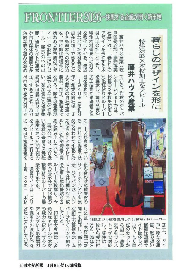 投稿日:2026.01.15 最終更新日:2026.01.16 お知らせ 日刊木材新聞掲載のお知らせ 「日刊木材新聞」に掲載されました 新春特集において、【FRONTIER2026~挑戦する企業が開く新市場】欄に、掲載していただきました。 ぜひご覧ください。 この記事をシェアする X(旧Twitter) Facebook LINE