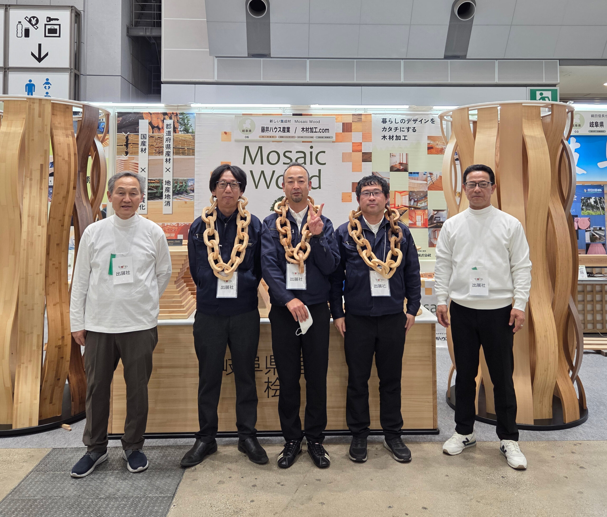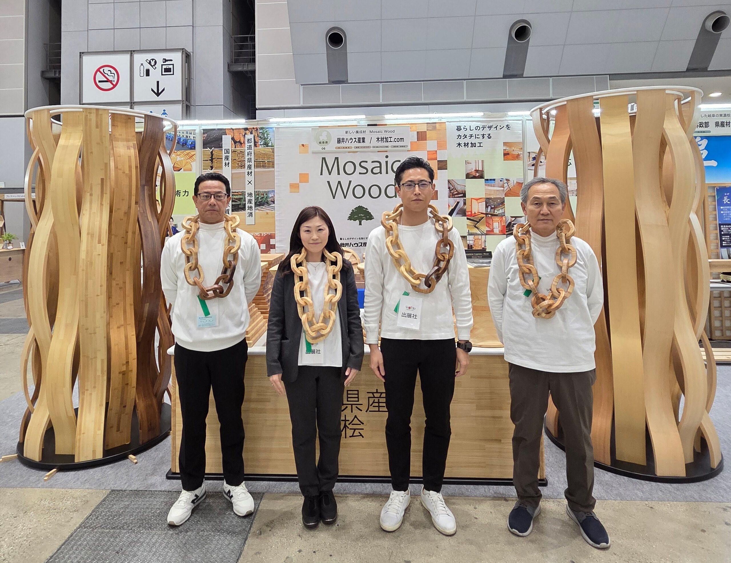 また、【Mosaic Wood チェーン】も多くの来場者の方々に興味を持っていただき、身に付けて記念撮影される方もみえました。