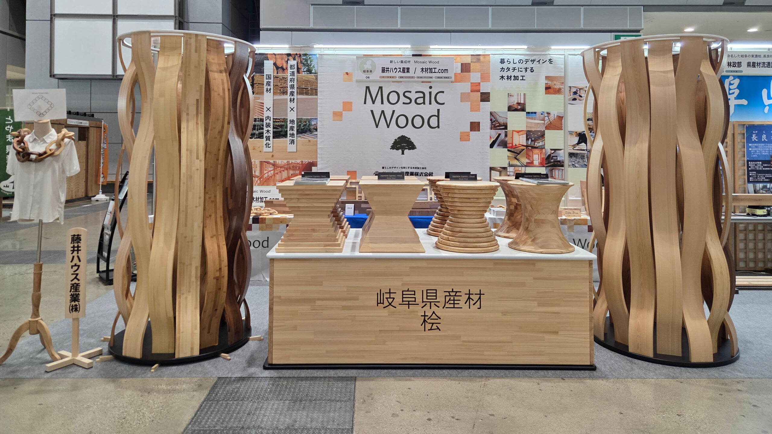 多くの来場者の方々にブースにお立ち寄りいただき、岐阜県産材の桧と杉をはじめ、様々な樹種の集成材で製作した