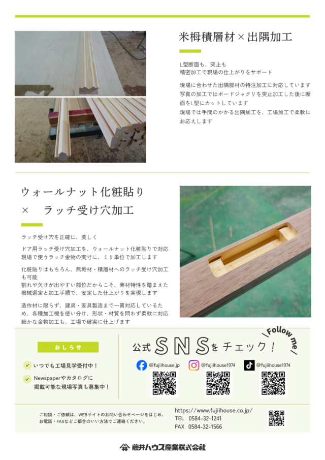 また、米栂積層材による出隅部材の特注加工、ウォールナット化粧貼りのラッチ受け穴加工など、現場の仕上がりを支える精密加工の事例も紹介しています。