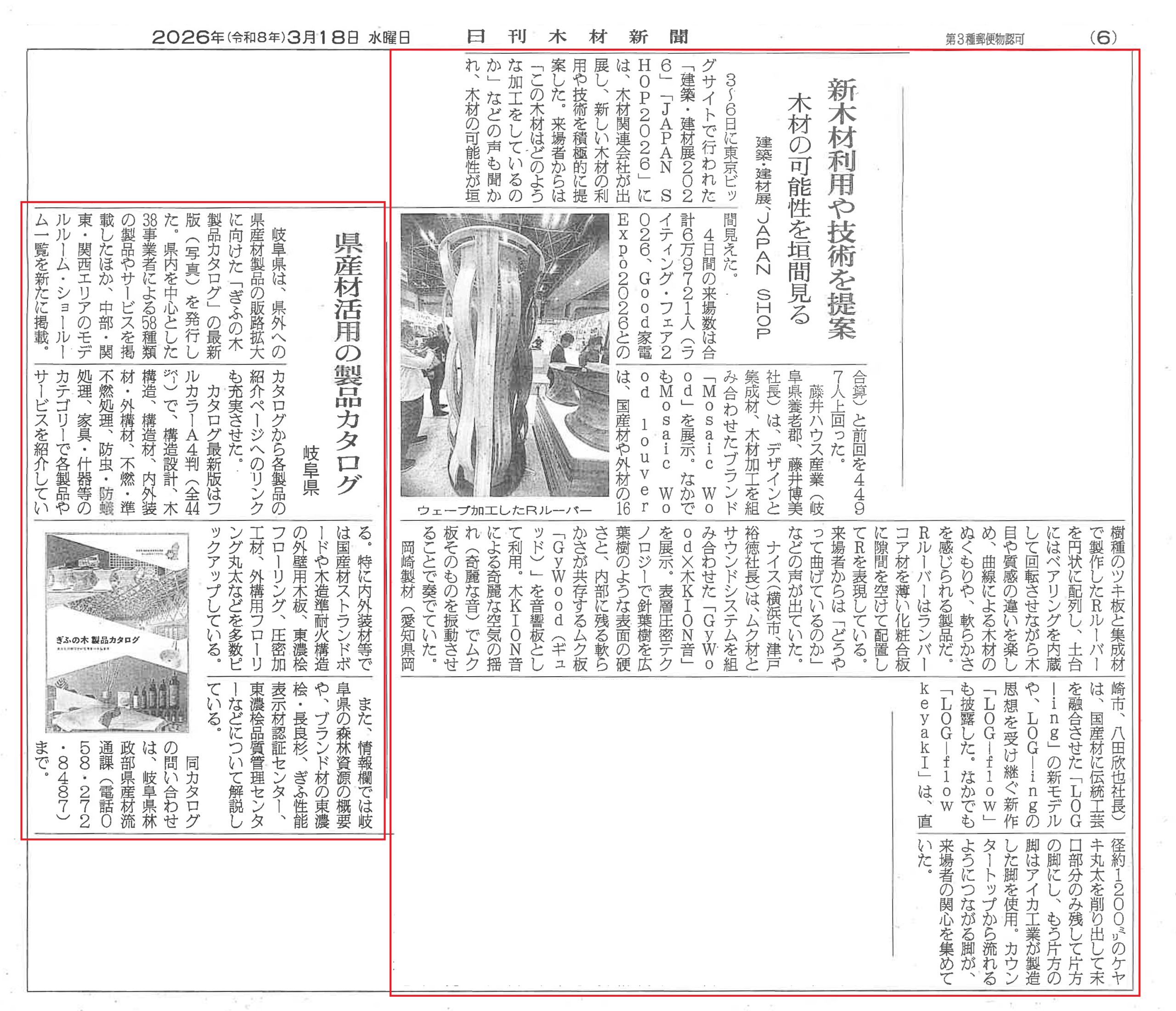 2026年3月18日付の日刊木材新聞に、3月3日~6日に東京ビッグサイトで開催された「建築・建材展2026」に関する記事が掲載され、その中で当社が紹介されました。