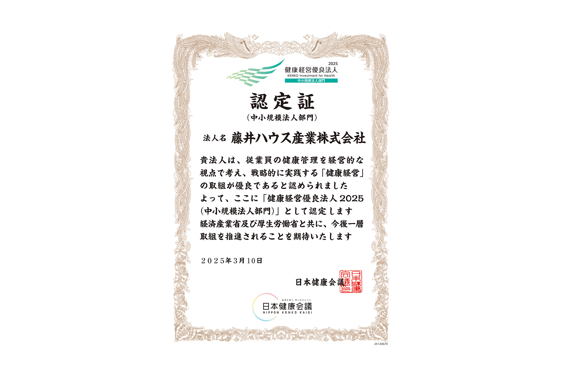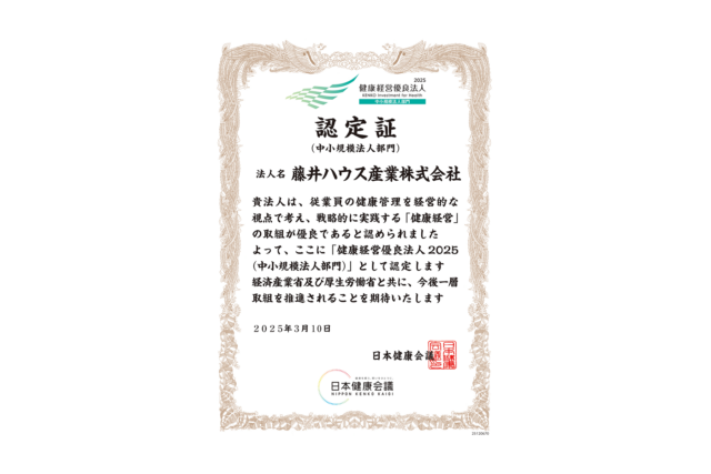 投稿日:2025.03.31 最終更新日:2026.04.08 お知らせ 健康経営優良法人2025(中小規模法人部門)に認定されました 当社はこのたび、「健康経営優良法人2025(中小規模法人部門)」に認定されました。 今後も、従業員が健康で安心して働ける職場づくりに取り組み、よりよい職場環境の整備に努めてまいります。 この記事をシェアする X(旧Twitter) Facebook LINE
